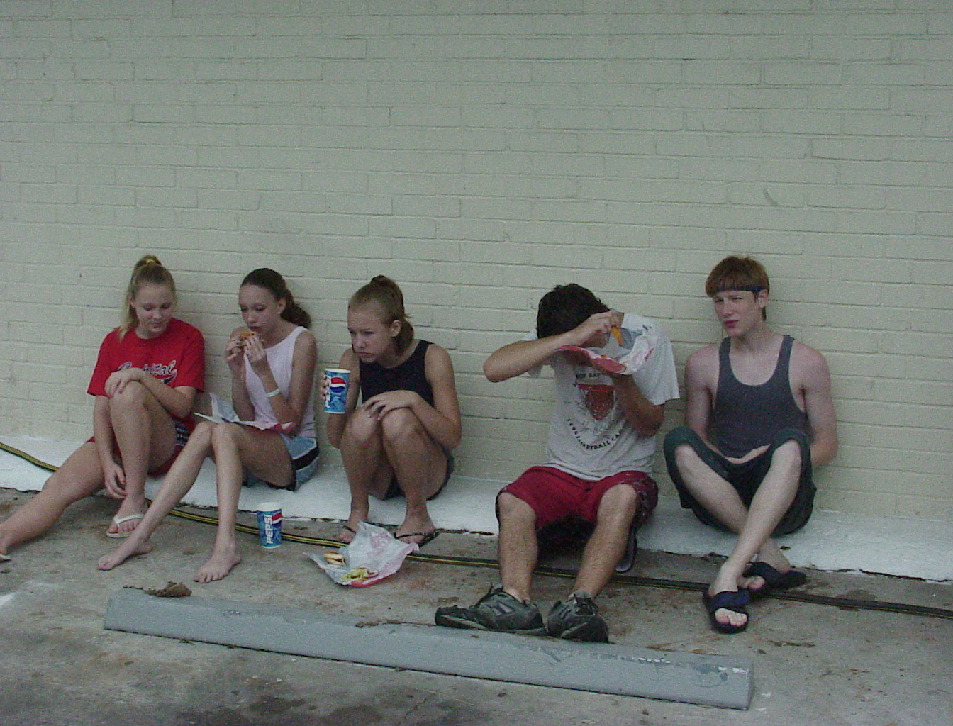 Lunch time! Alyssa Murphy, Hannah Wiley, Tara Waterman, Josiah "No pictures!" O'Neal, Michael Hannon. My wife summed it up; "They look like a bunch of refugees!" I guess they're just all up agains the wall. Hamburgers by Dairy Queen, |