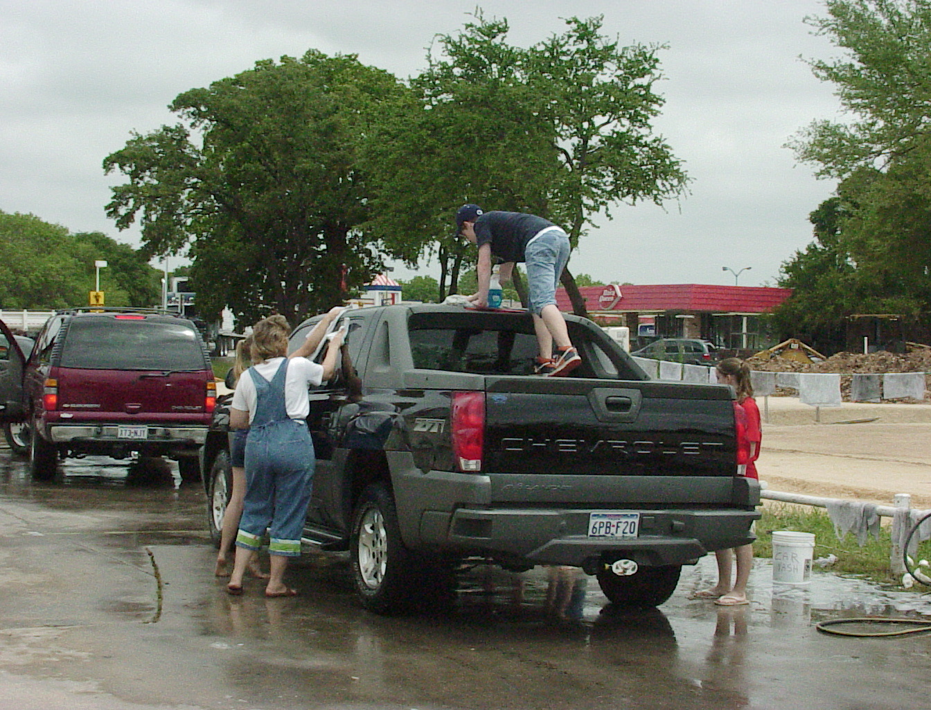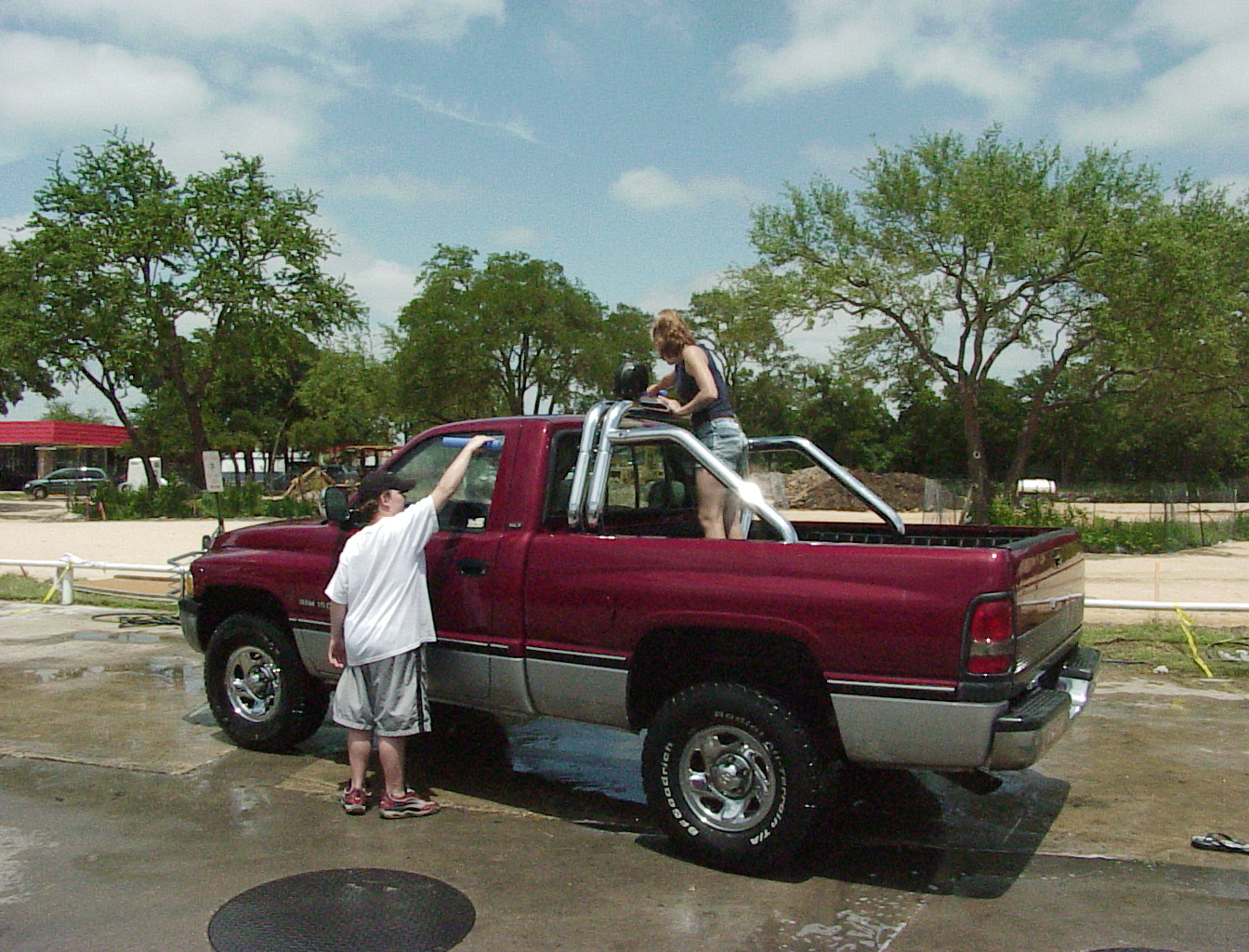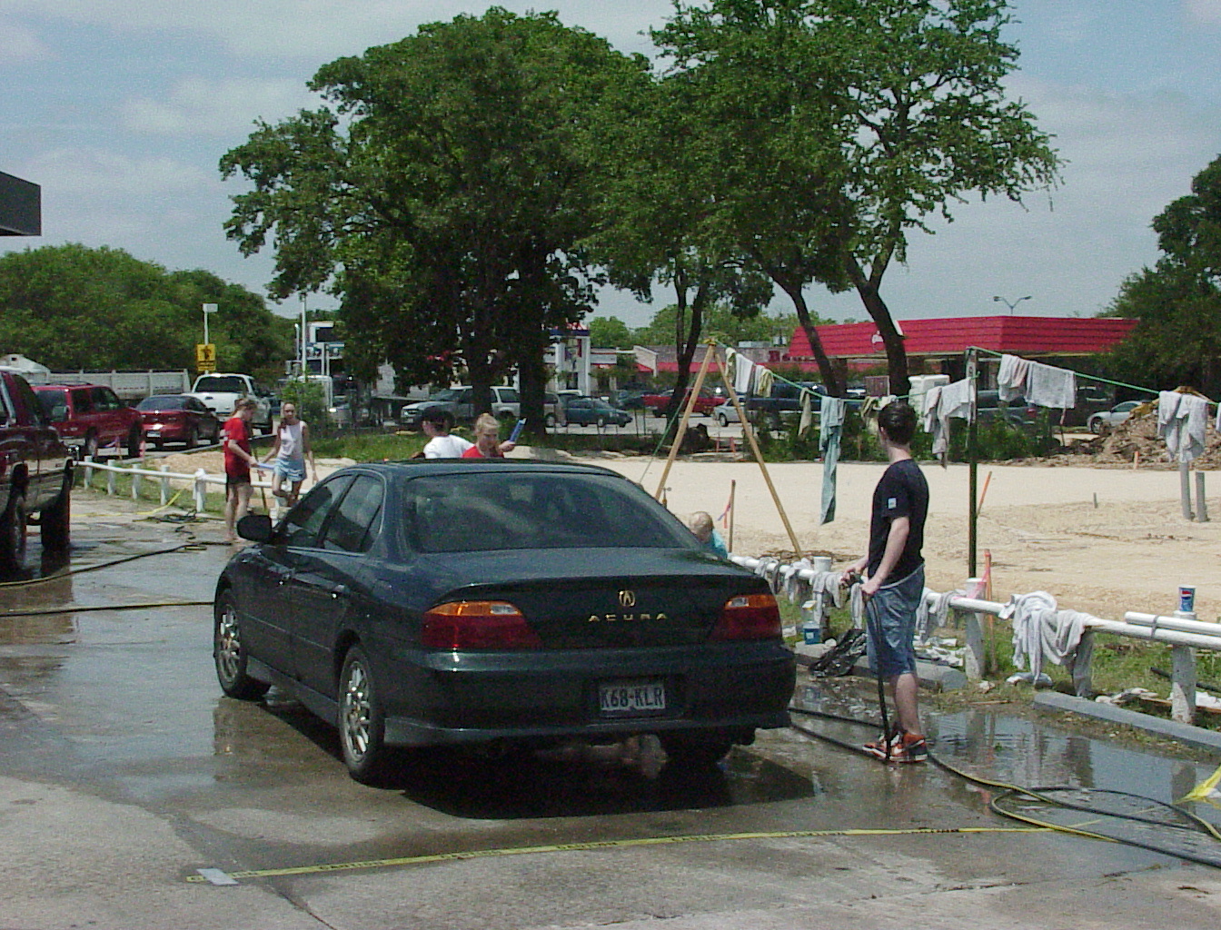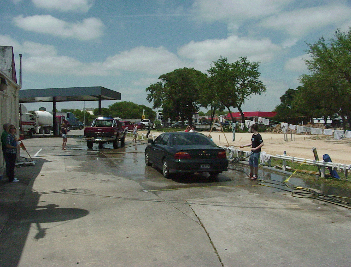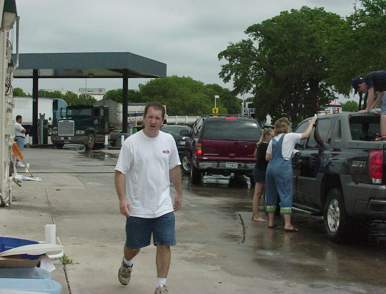 It may look like the back side of Nowhere, but it's really the back side of a Shell station on I35 in Round Rock. They get a lot of big rigs, but fortunately we didn't have to wash any of them this year (we have in the past). I think the clothes line for drying towels adds a touch of class. Or a touch of the trailer park. Whatever. (Before anyone gets offended, I have lived in a trailer park, and so have some of my best friends. They're great! Really! I'm thinking of selling my home and moving into one, again, if only to attract more tornados!) That's Susan Wiley, our resident spy, on the left. She thinks she's safely disguised in those shades, but this crack journalist pierced the veil. |