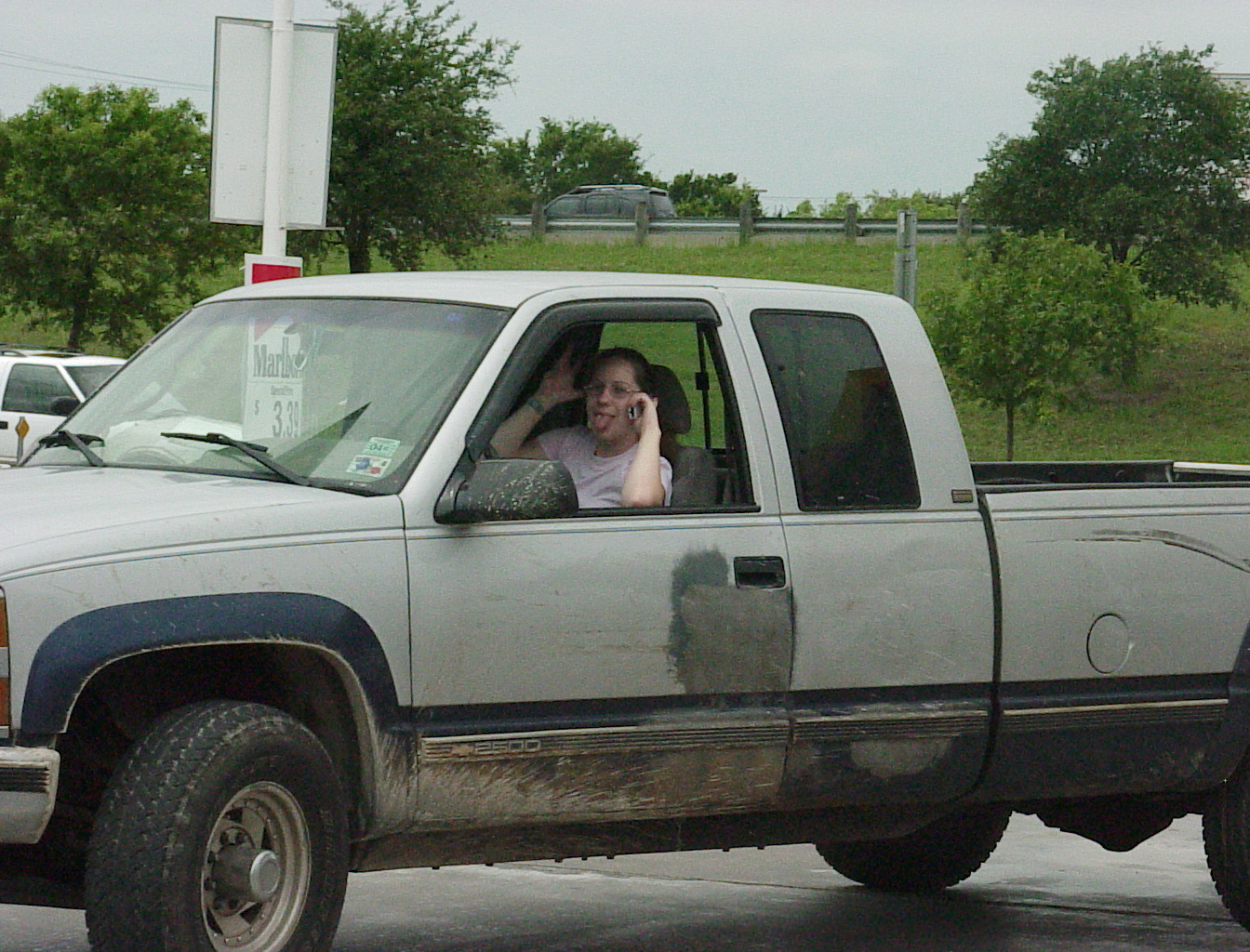 Here's a typical customer, a jaded, bored cowgirl. You can tell by her weathered face and her stoic, non-commital expression that she's seen it all, and wasn't impressed. Here to get the prairie poop off her ranch truck, she hasn't got time for fun and games. She's tired of the line, and just wants to get the truck washed so she can mosey on back yonder. Her name is Shaunda, and she bunks with two very large, protective Great Danes, a cat, a parrot, and a computer that routinely eats CD-ROMs. Your typical cowgirl. |