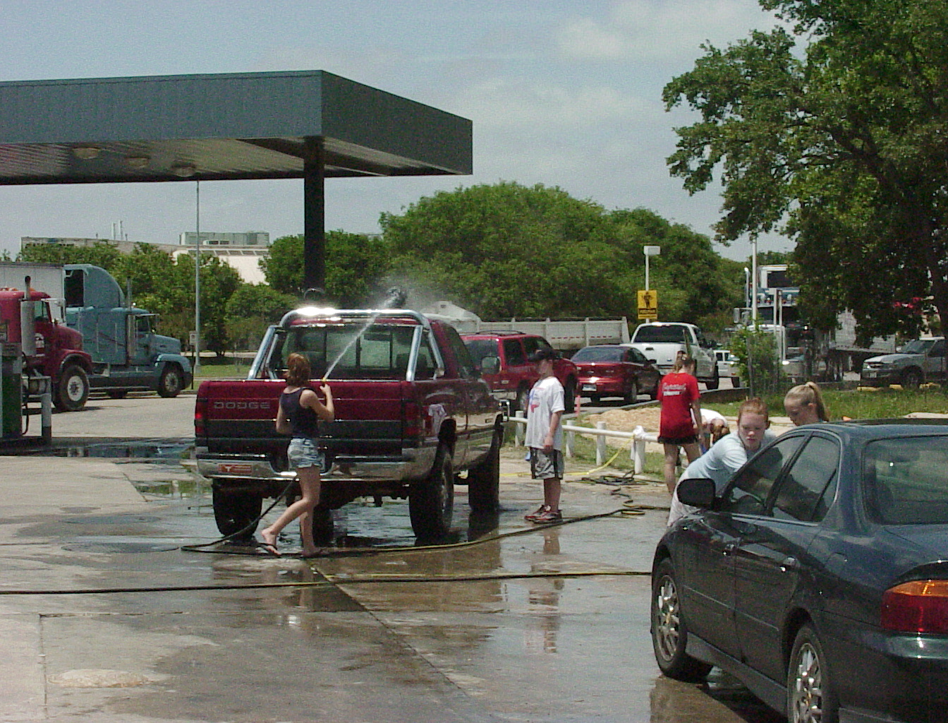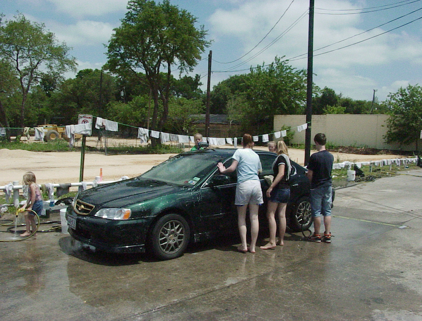 Tara practices her marksmanship, rinsing the roll bar while TJ watches, ready to jump in at a moment's notice and point out any spots she missed. Ariella and Katie carefully dry the car; it's all about the details. In the background, Janelle and Hannah are either washing mitts and rags, or maybe washing their hair. With junior high girls, it could be either or both. |