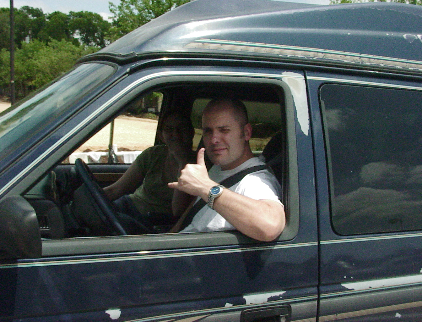 A van full of Andersons. They were chosen at random to have their pictures taken as representative of the many brave souls who valiantly drove their cars in for a free (no hidden fees, no please for donations) car wash. Plus, their kids are almost terminally cute and love to climb on me. Even a hard-bitten, jaded, journalistic type can't resist that. |