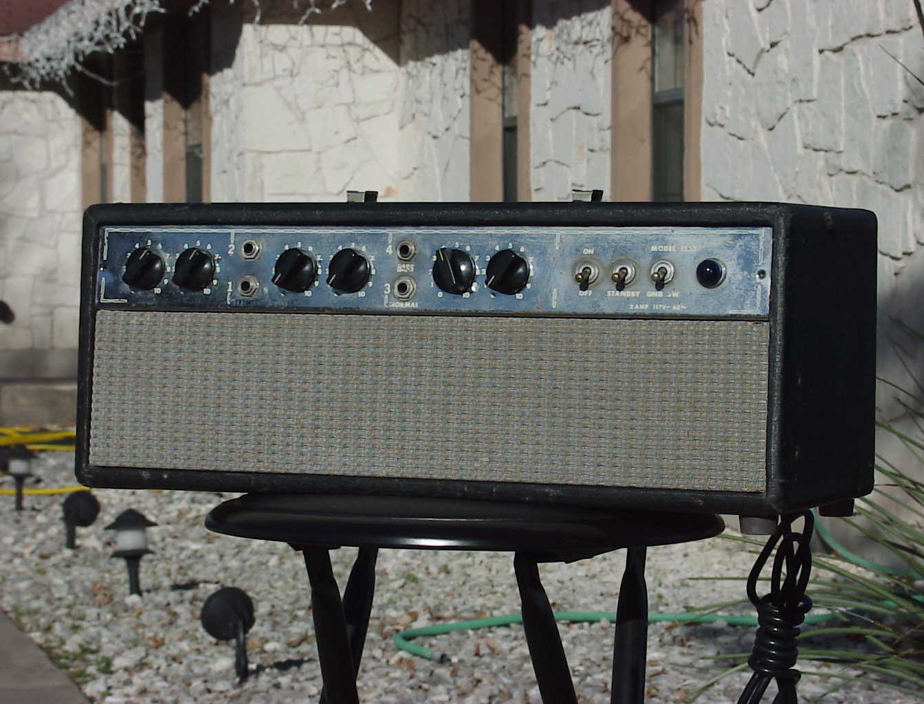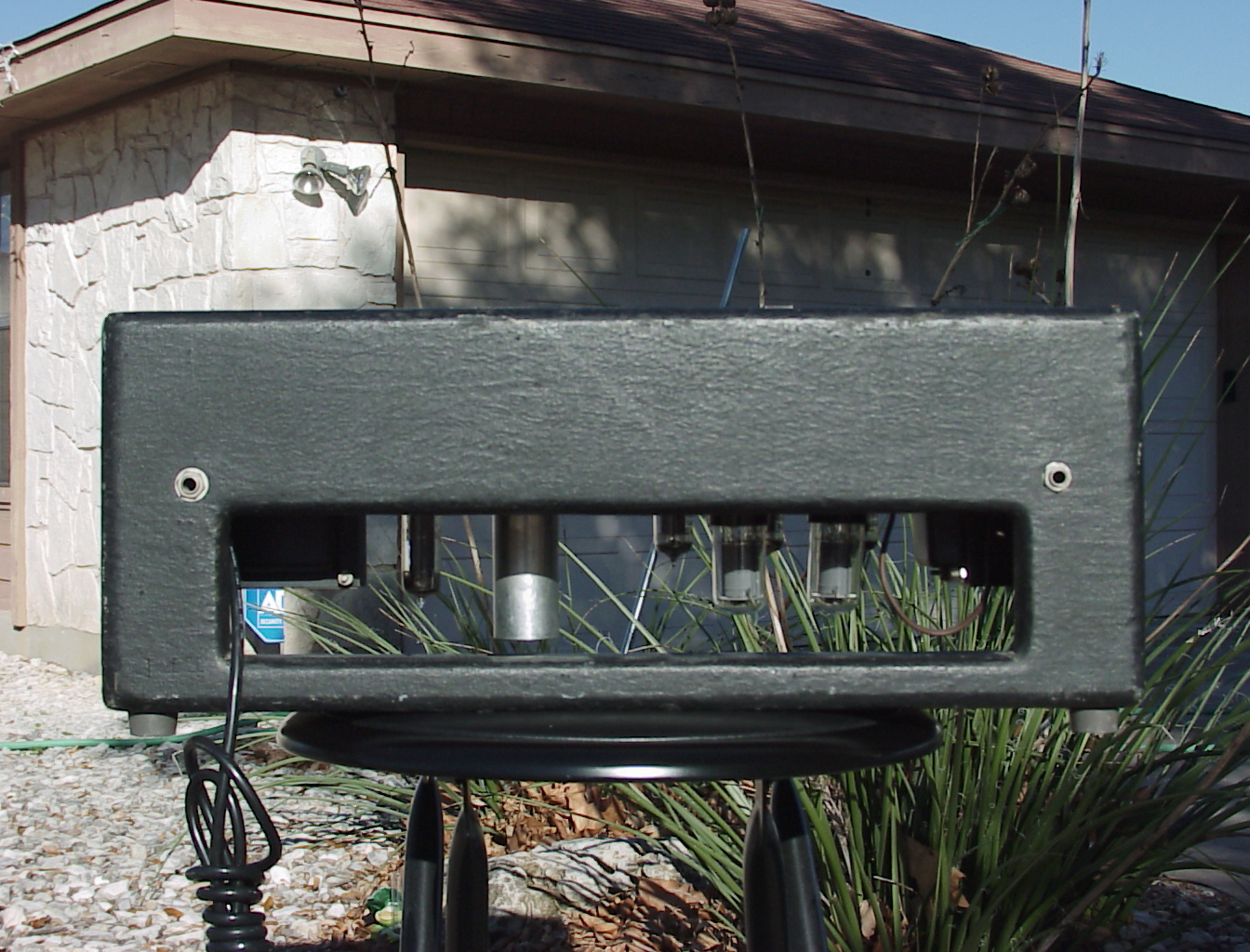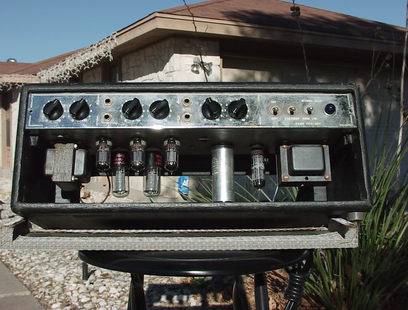 Why are these photos in black and white? This amp was built in the 1960s. The world was mostly still black and white so the amp was built black and white. Even today, the amp just sucks the color right out of the surrounding area. But I couldn't see making you download larger images in black and white; they might permanently destroy your monitor's or printer's abaility to produce color, or even burn out the color cells in your eyes. So when you click on the images, you'll see enlarged, colorized versions. Ted Turner needed the work, so he did it cheap. I'm hoping he can do the same for the real world cacti in the background; they can use the chlorophyl.
