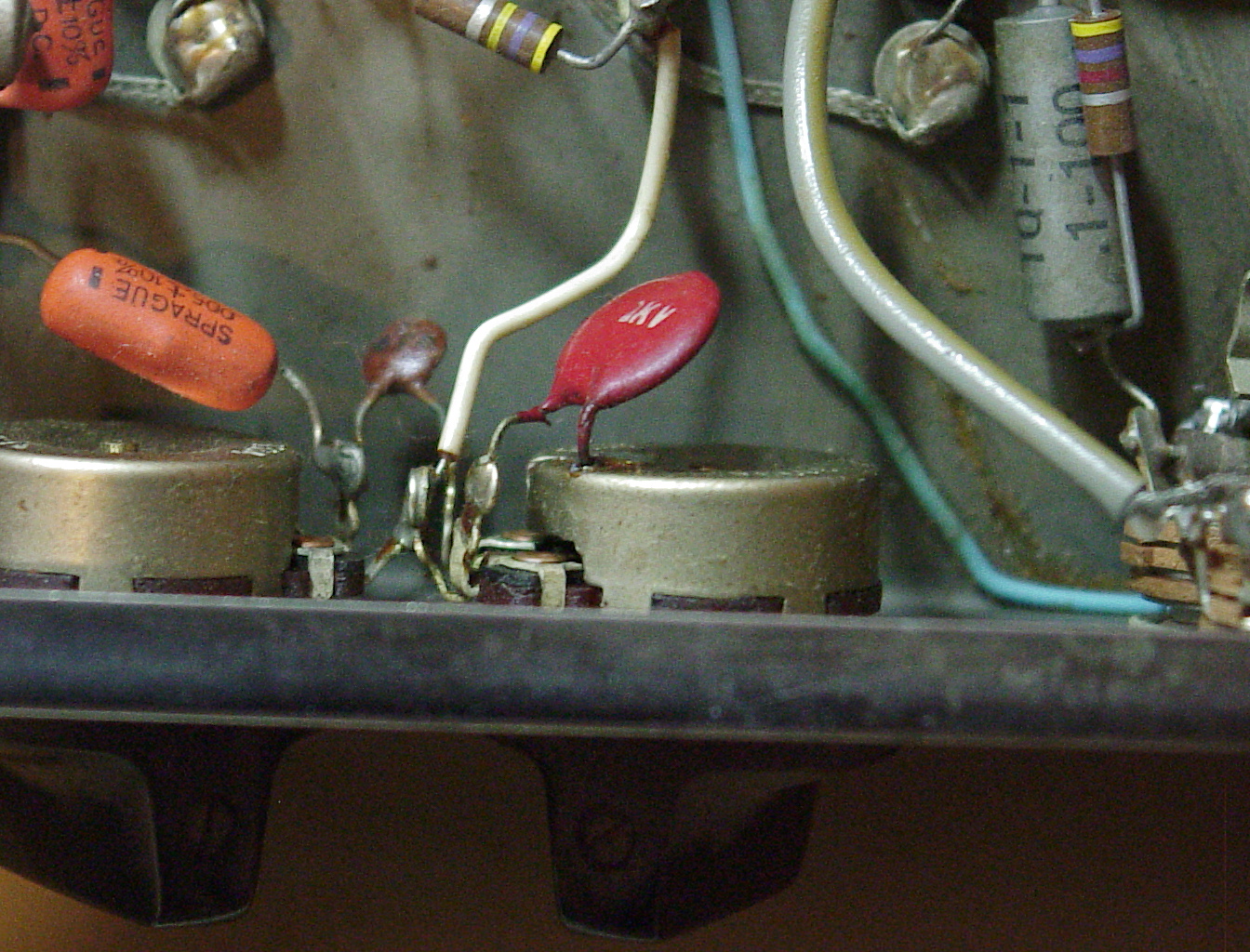 Soldered mount detail: Here is a better view of a terminal strip mounted with solder rather than a bolt. As with the case noted above, there's no electrical need for this, as there are no leads attached to this terminal. In fact, they snipped off the top of most of the ground terminals! Components are mounted on the terminal strip through-holes as well as the terminals proper. The RCA jack at the bottom, like the output jack (not shown), depends on the bolts and lock washers for electrical ground. The terminal strip at the far right is mounted only at one end; the other end is hanging free in space.