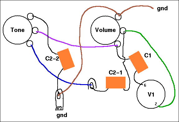 The modified circuit leaves things where they are as much as possible. The brown wire between the pots now goes to a grounded lug where it connects to the new capacitor. The blue lead was moved to the other side of the tone pot. Without this change, the pot would work backwards to the normal scheme; full treble would be counter-clockwise. The new wire is purple in the diagram; proper color coding would suggest blue wire for this, since it's closer to the plate than to the next stage's grid.