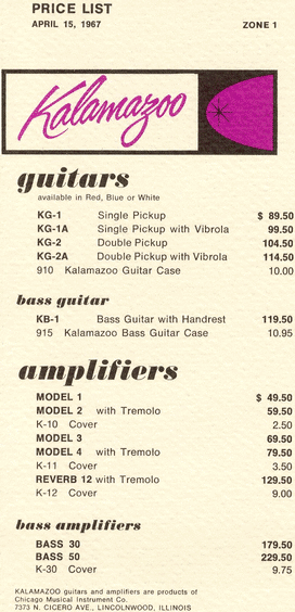 Model Apr 1967 Price Sep 1967 Price Jun 1968 Price Today's Price Model 1 $49.50 $59.50 $49.50 $50 - $200 Model 2 $59.50 $69.50 $59.50 $50 - $300 K-10 Cover $2.50 $2.50 $2.50 $5 - $15 Model 3 $69.50 $79.50 $69.50 $20 - $50 Model 4 $79.50 $89.50 $79.50 $20 - $50 K-11 Cover $3.50 $3.50 $3.50 $5 - $10 Reverb 12 $129.50 $129.50 $129.50 $100 - $350 K-12 Cover $9.00 $9.00 $9.00 $5 - $20 Bass 30 $179.50 $179.50 $179.50 $50 - $150 Bass 50 $229.50 $229.50 N/A ? K-30 Cover $9.75 $9.75 $9.75 ? The "then" prices are straight from official price lists such as this one from April 15, 1967 (64KB 272x564 GIF or 150KB 544x1128 JPEG), which was scanned in by Bjorn Anger (keeper of the mighty Holiday for Strings Gibson amp pages). The later two price sets came from much lowre resolution scans, so it's possible there are errors there, but I spent a fair amount of time playing with them in xv and the gimp (image manipulation applications), so I'm reasonably confident of their accuracy. It's rather amusing today that the Model 3 and Model 4 solid state amps were more expensive than the Model 1 and Model 2 tube amps they were about to replace (for the brief period they survived in the market). The solid state models were identical, feature-wise, to their tube counterparts, but you have to remember that at the time, solid state was new and different. They were touted as never wearing out (compared to tubes), more efficient (needing less power, generating almost no heat). They also had more complex cabinets which cost more to manufacture. Finally, the speakers were slightly better (45% larger magnets) on the solid state models. Hence the premium for the solid state amps.