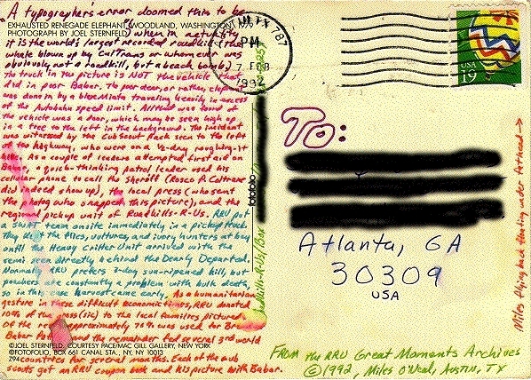 A typographer's error doomed this [post card] to be [titled] ``Exhausted Renegade Elephant'' (Woodland, Washington, 1979, Photography by Joel Sternfeld) when in actuality it is the world's largest recorded roadkill (the whale blown up by [Oregon D.O.T.] was obviously not a roadkill, but a beach bomb).