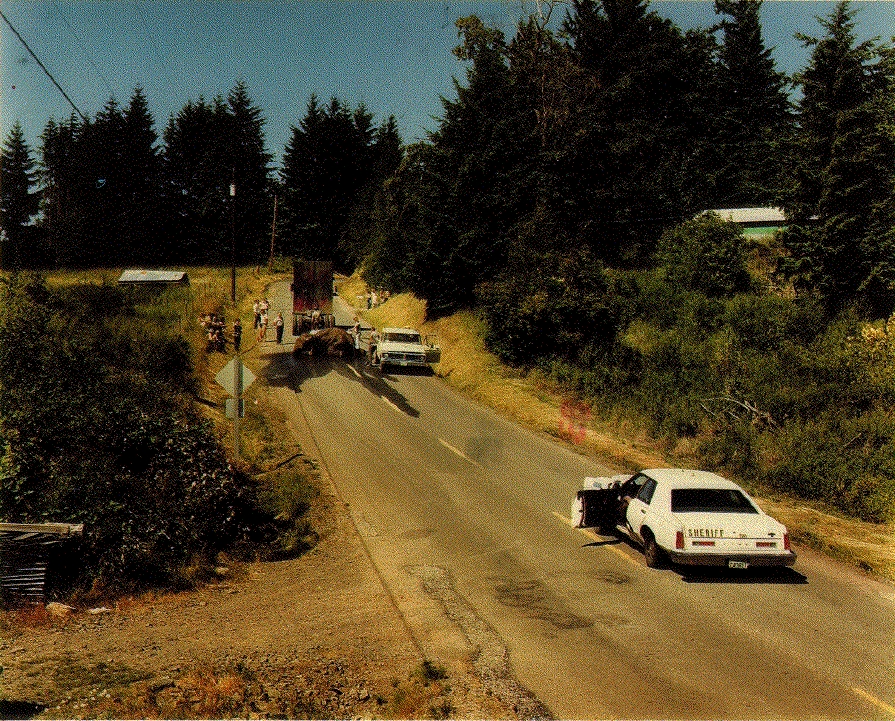 The incident was witnessed by the Cub Scout pack seen to the left of the highway, who were on a 1/2 day, roughing it hike. As a couple of leaders attempted first aid on Babar, a quick thinking patrol leader used his cellular phone to call the sheriff (Rosco P. Coltrane did indeed show up), the local press (who sent the photog who snapped this picture), and the regional pickup unit of Roadkills-R-Us.
